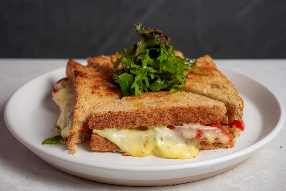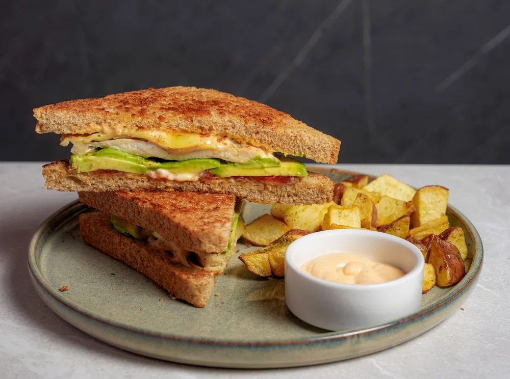 Doble pan molde integral a la plancha con filete de pollo al grill, palta, tomate confitado, champiñones, queso andino y salsa de la casa, acompañado de papas andinas.