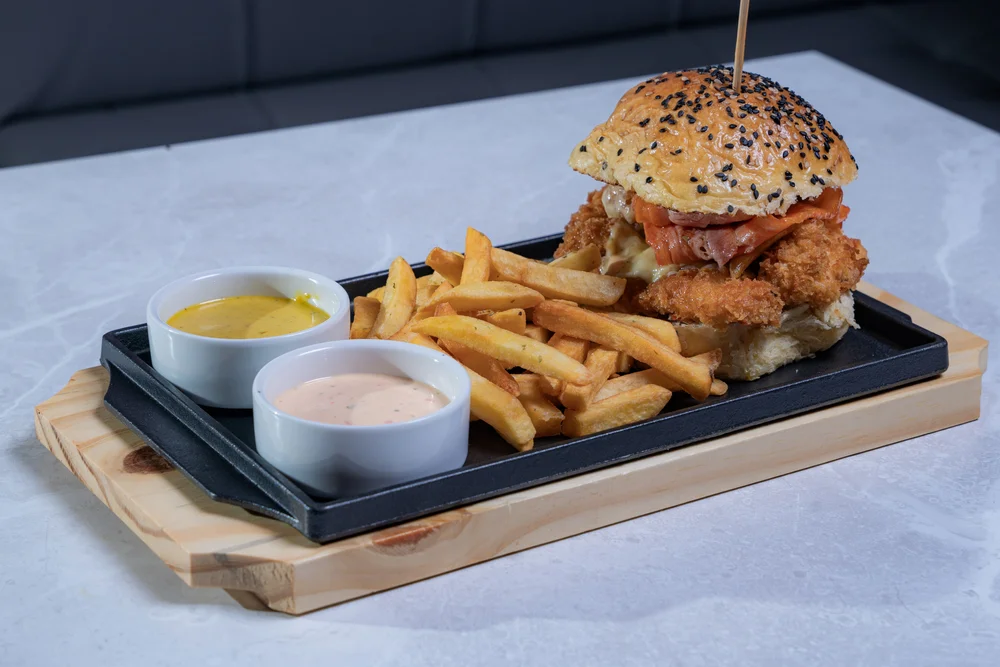 200 gr. de filete de pollo crocante sazonadas con especias de la casa, queso andino, pepinillos encurtidos, tomate confitado coronado con laminas de tocino, servido en nuestro pan brioche casero acompañado de papas fritas.