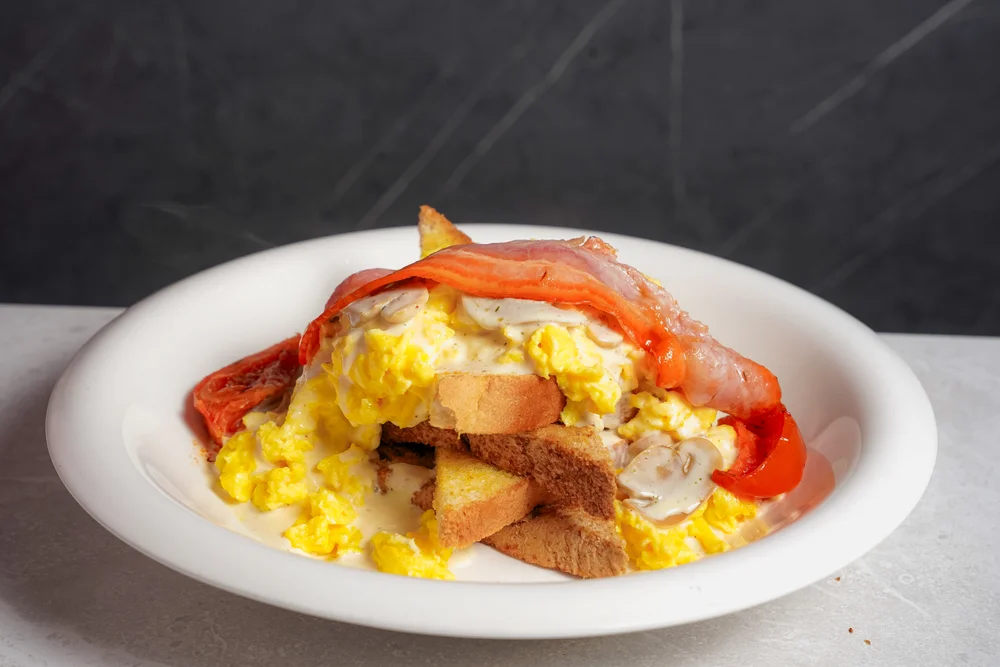 Pan tostado, montado con huevos revueltos, crema con champiñones al ajo, tocino y tomates al horno.