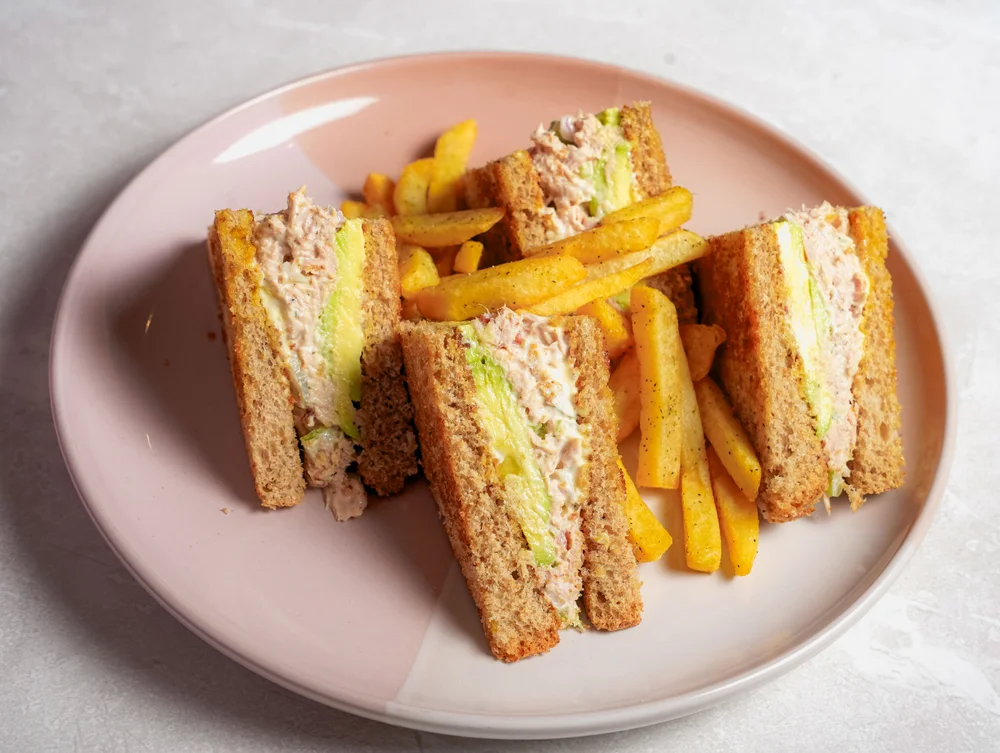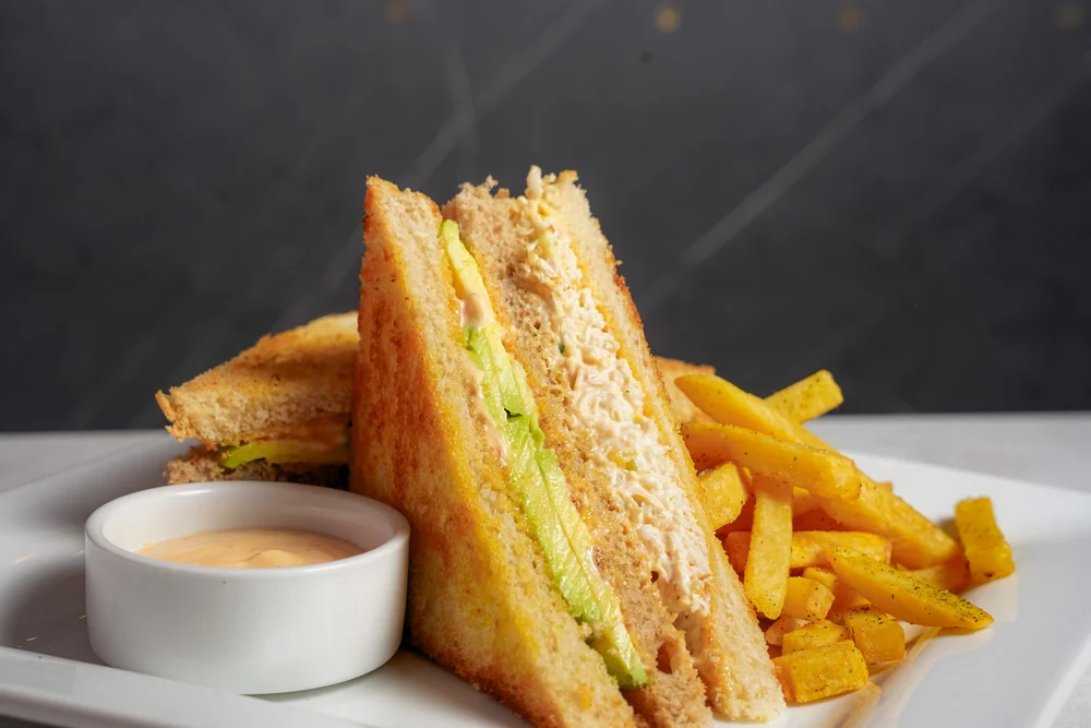 Triple de pan en molde a la plancha, con pollo deshilachado, durazno, apio, mayonesa y palta, acompañado de papas fritas.