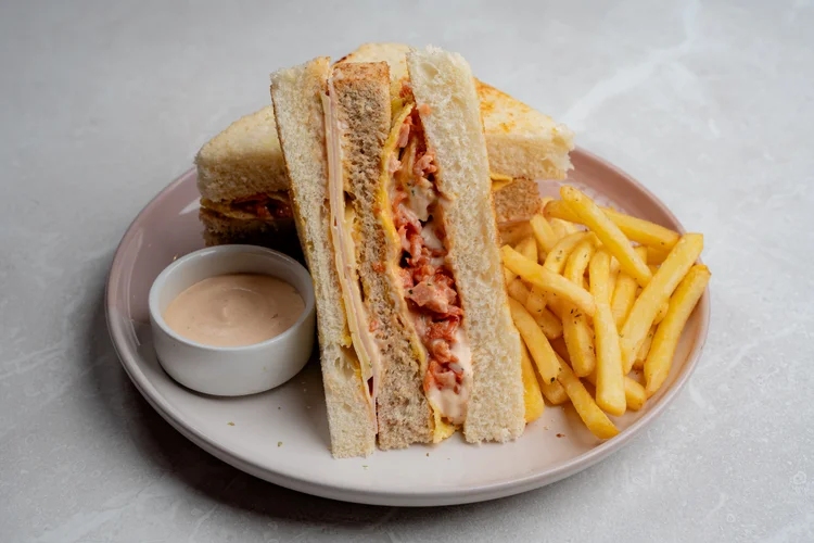 Triple de pan en molde a la plancha, queso andino, jamón inglés, huevo, tocino en salsa de la casa acompañado de papas fritas.